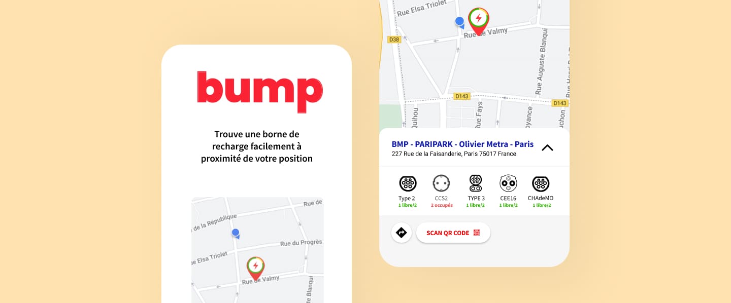 Bump Charge permet aux utilisateurs de voitures électriques et aux professionnels de la mobilité de localiser en ligne la borne de recharge la moins chère et la plus proche pour la réserver et lancer une recharge. Elle géolocalise toutes les bornes publiques avec le nombre et le type de prises proposés, si celles-ci sont occupées ou désactivées, sans oublier le tarif appliqué.